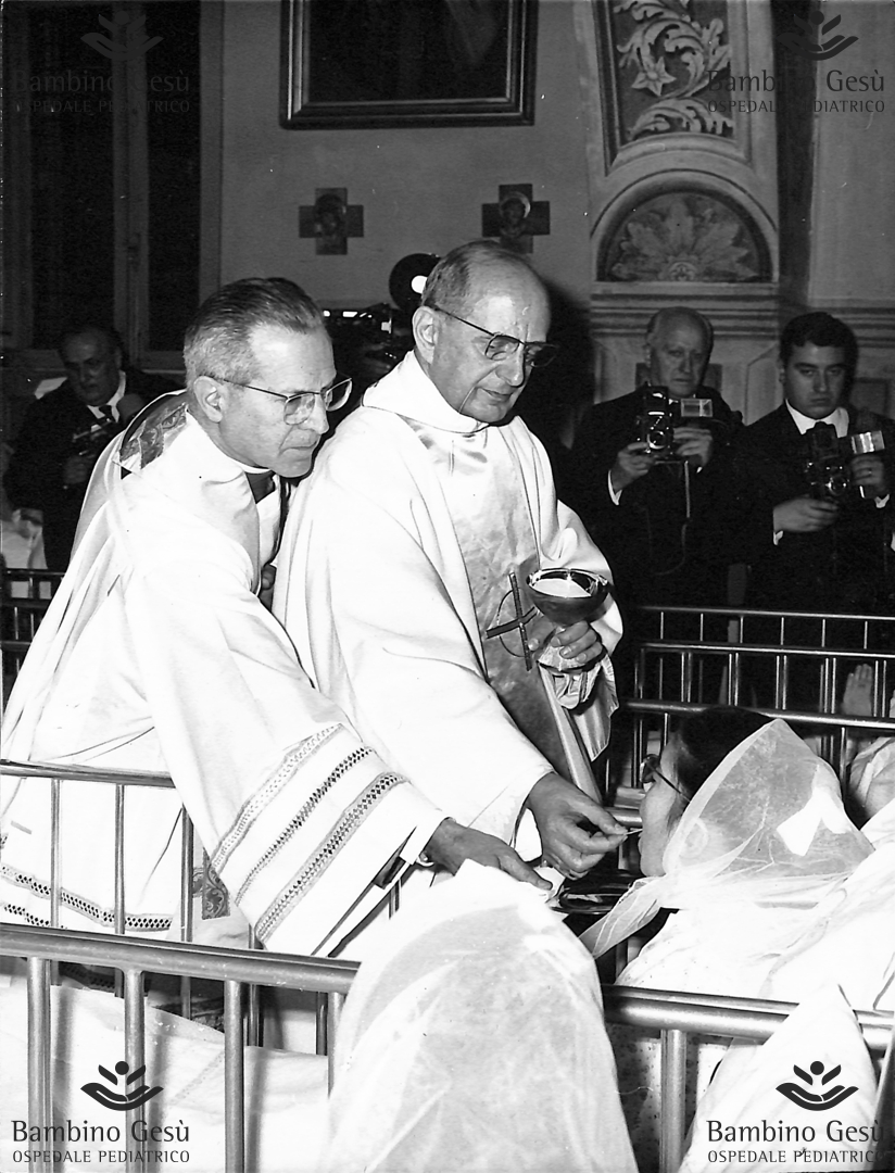 Il Papa durante la distribuzione dell'Eucarestia. Davanti a lui una piccola paziente nel lettino