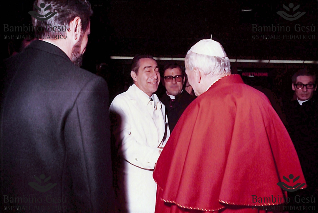 Giovanni Paolo II saluta il professor Elio Guzzanti, direttore sanitario, al suo arrivo davanti al Padiglione Pio XII. Di spalle il presidente Marcello Sacchetti