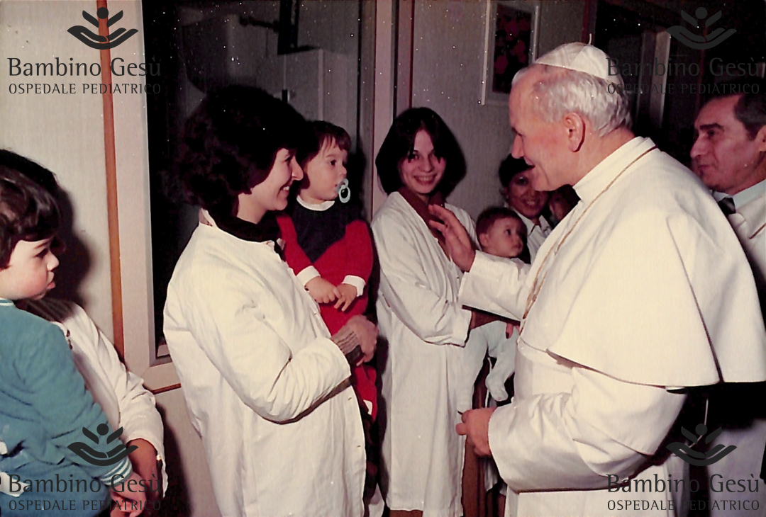 Giovanni Paolo Ii saluta i genitori ed i bambini che lo attendono lungo un corridoio del Padiglione Pio XII. Dietro di lui il Direttore Sanitario Elio Guzzanti