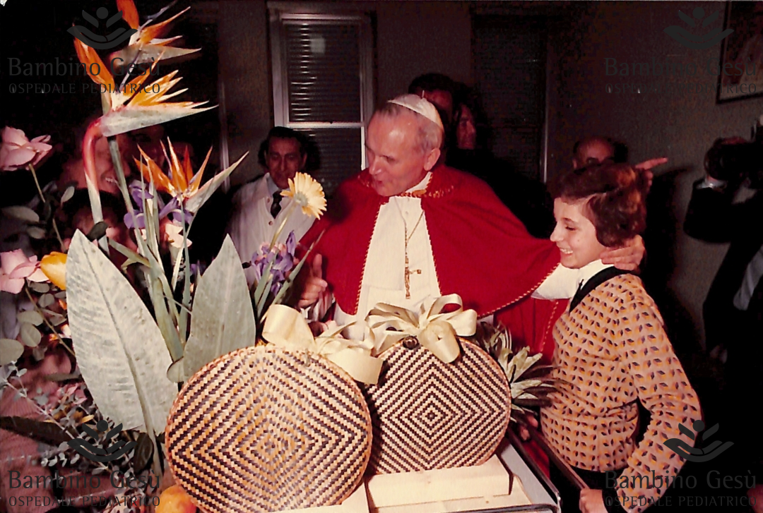Giovanni Paolo II a colloquio con una paziente davanti ad una composizione floreale che gli è stata donata. Sullo sfondo il direttore sanitario Elio Guzzanti