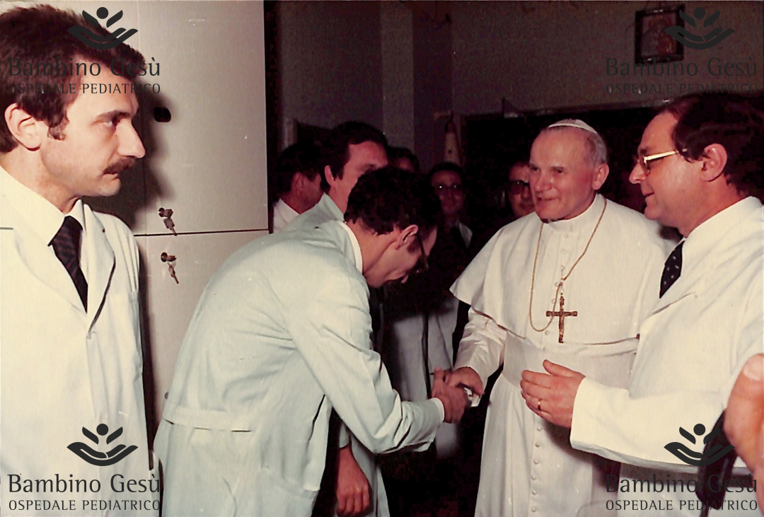 Giovanni Paolo II saluta il gruppo dei medici anestesisti. Sono riconoscibili il dott. Massimo Ferrario (a sinistra) ed il primario, Prof. Franco Gianturco (a destra)