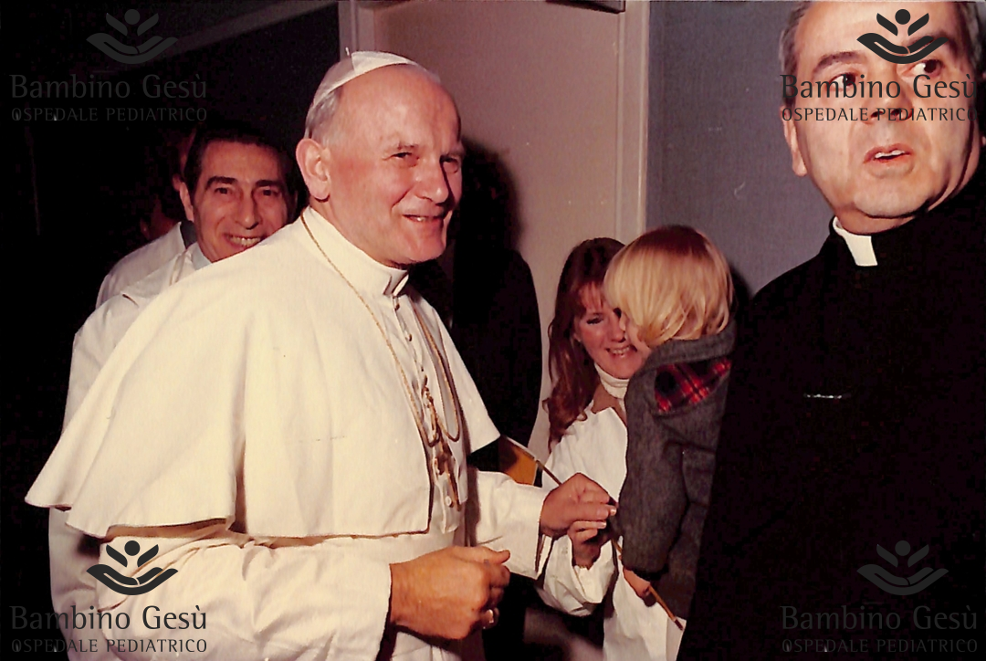 Giovanni Paolo II sorridente durante la sua visita. Dietro di lui il Direttore Sanitario Elio Guzzanti. A destra Mons. Fiorenzo Angelini, delegato per la Pastorale Sanitaria della Diocesi di Roma