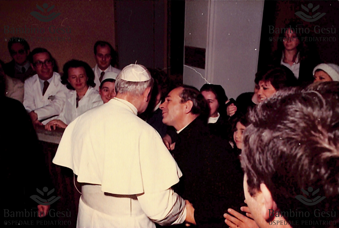 Giovanni Paolo II saluta le persone radunate dietro le transenne poste lungo i corridoi dell'Ospedale