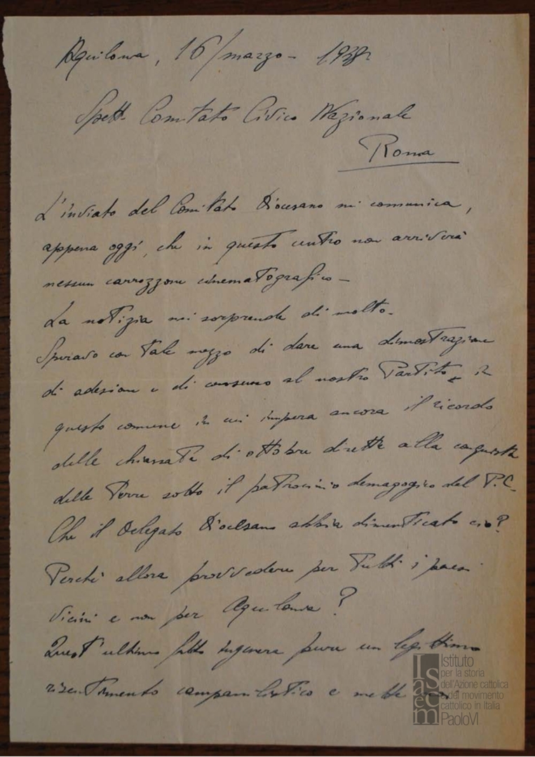 Lettera del segretario della sezione della Democrazia cristiana di Aquilonia (AV) al Comitato civico nazionale