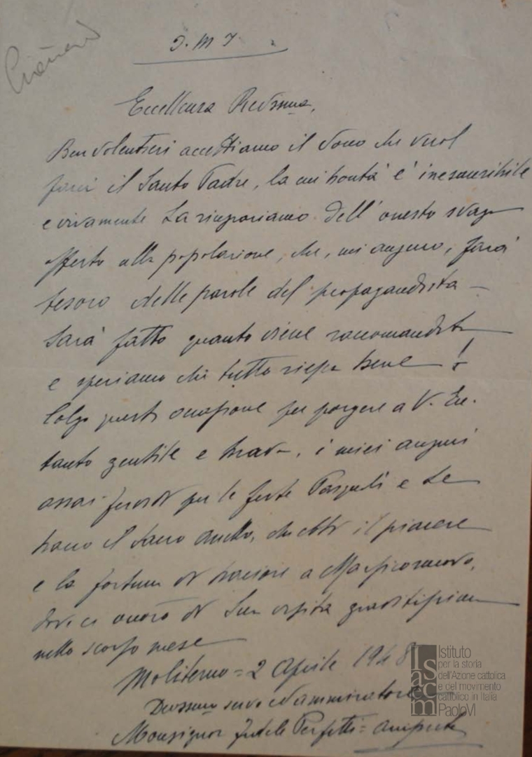 Perfetti ringrazia per l'invio dell"onesto svago offerto alla popolazione" [di Moliterno(PZ)]