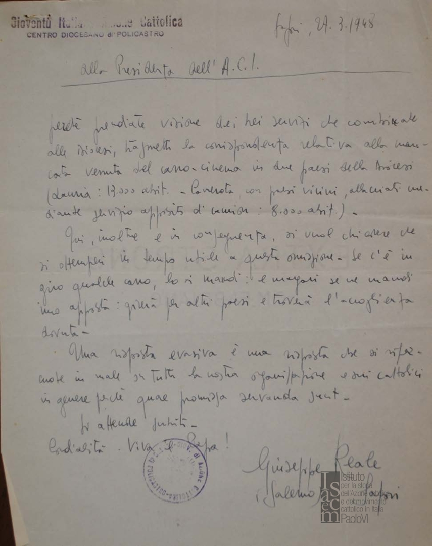 L'arciprete di Camerota lamenta il mancato invio del carro cinema, Cartolina postale