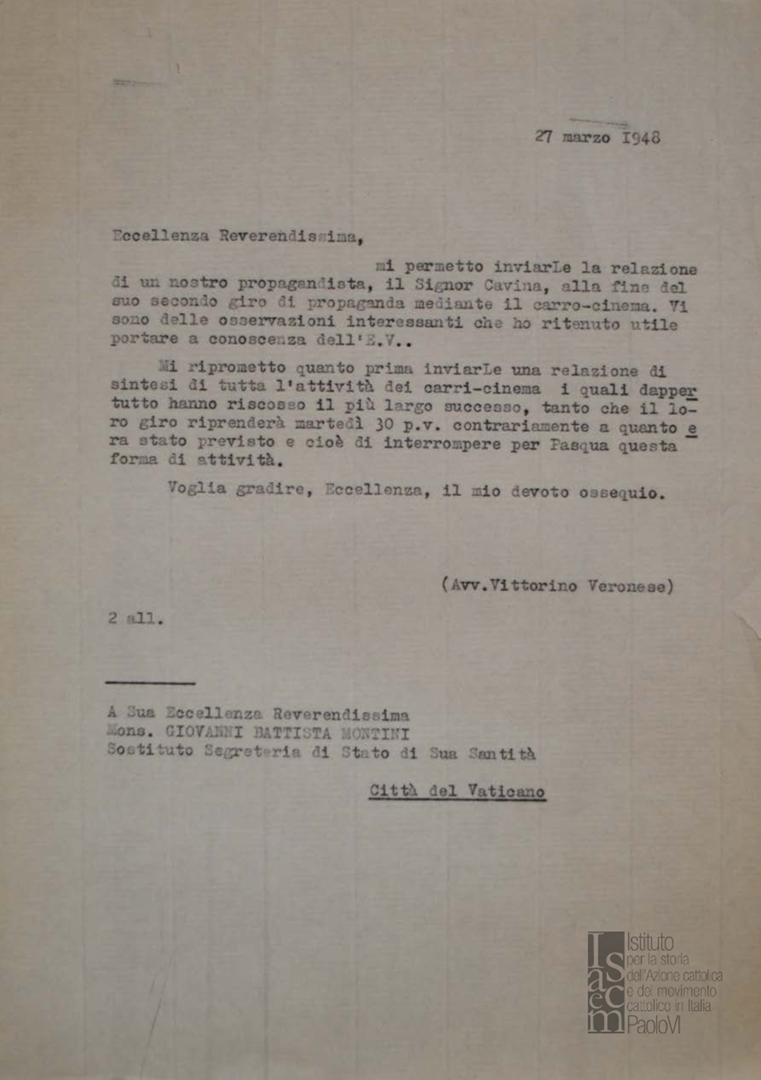 Lettera di Vittorino Veronese, presidente dell'Azione cattolica, a mons. Giovanni Battista Montini, sostituto alla Segreteria di Stato della Santa Sed