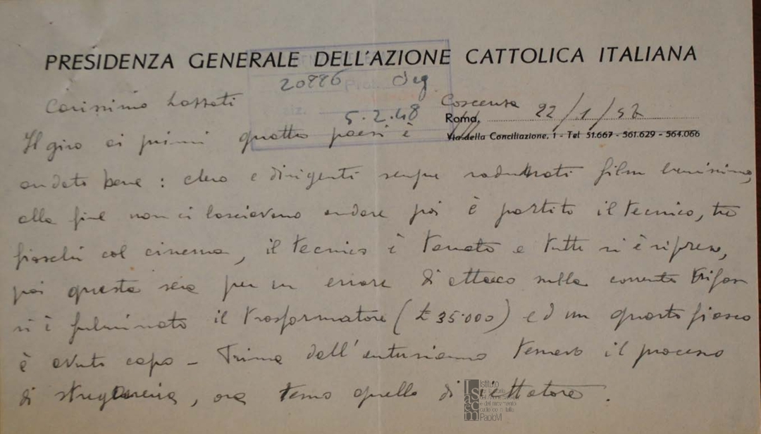 La Presidenza generale dell'Azione cattolica italiana scrive al prof. Giuseppe Lazzati in merito alla propaganda dei carrozzoni cinematografici. Manoscritto