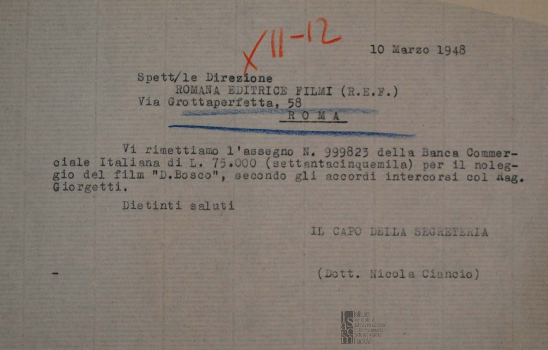 L'avv. Nicola Ciancio rimette alla direzione della Romana editrice film - REF la ricevuta per il noleggio del film "Don Bosco". Dattiloscritto