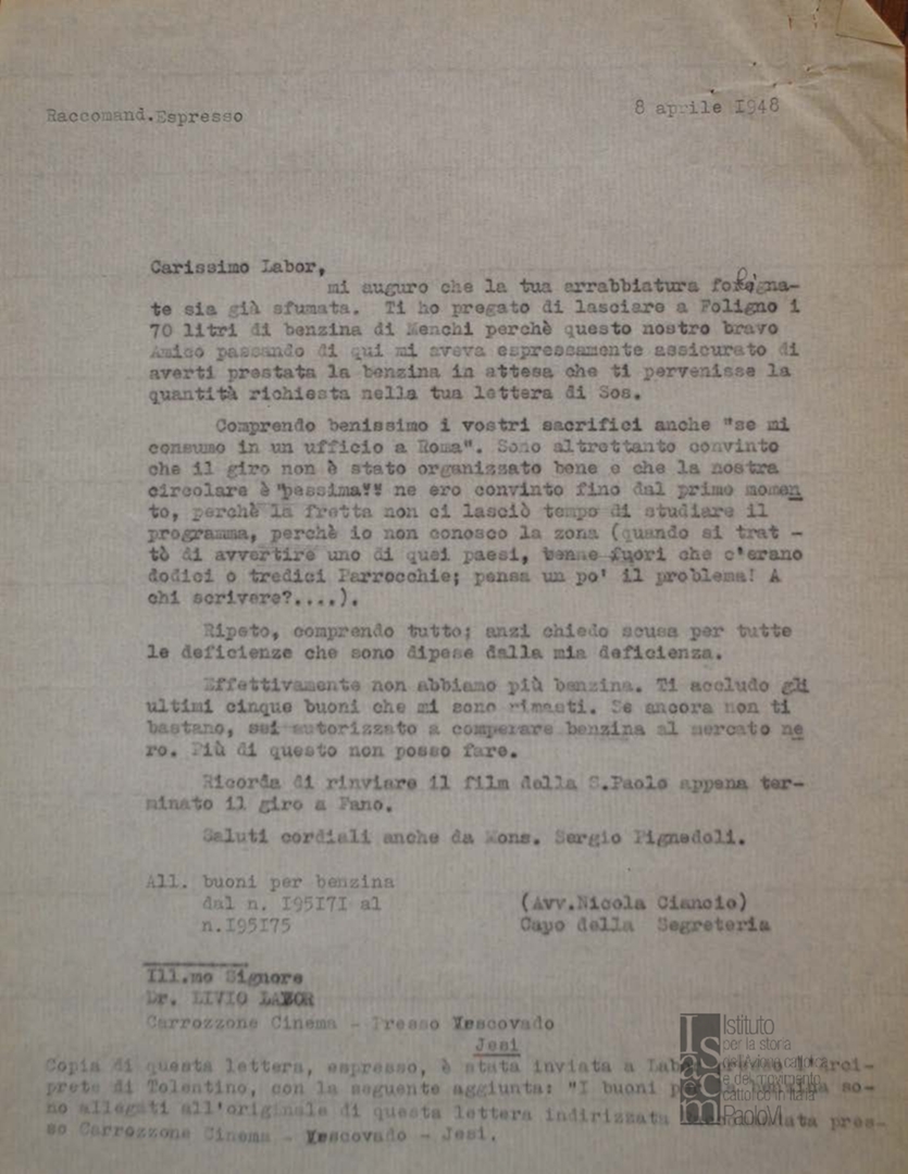 Nicola Ciancio scrive a don Livio Labor in merito alla dotazione di carburante per le auto utilizzate per la propaganda cinematografica. Dattiloscritto