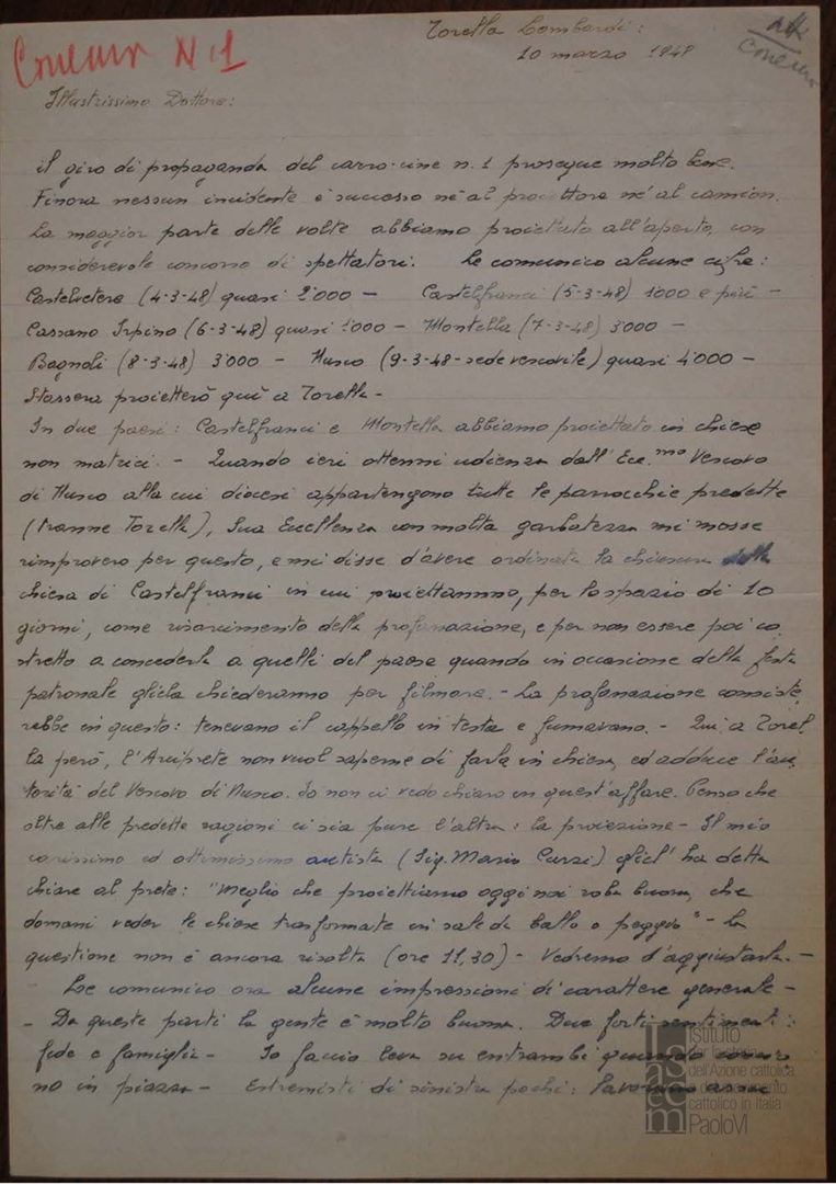 Accursio Ajassa scrive un resoconto del giro di propaganda dei carrozzoni cinematografici in alcuni comun della provincia di Avellino. Manoscritto