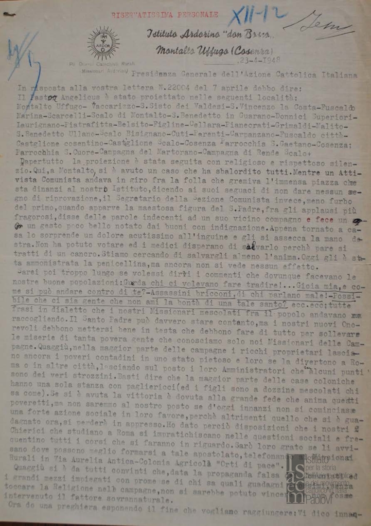 Mons. Gaetano Mauro scrive alla presidenza centrale dell'Azione Cattolica per fornire un resoconto dell'attività di propaganda cinematografica svolta dai Padri Missionari Ardorini nei comuni rurali della provincia di Cosenza. Dattiloscritto