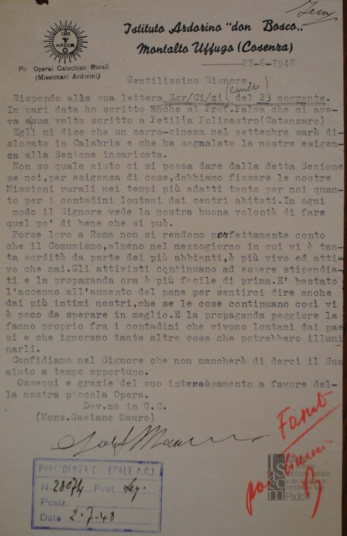 Mons. Gaetano Mauro scrive a Nicola Ciancio in merito alla propaganda con i carri cinema in Calabria in funzione anti comunista. Dattiloscritto