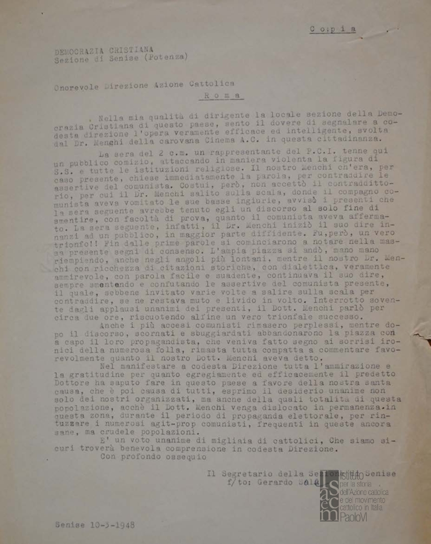Gerardo Sole segnala alla Direzione dell'Azione Cattolica l'efficacia della propaganda cinematografica in funzione anti comunista svolta dal dott. Menchi. Dattiloscritto
