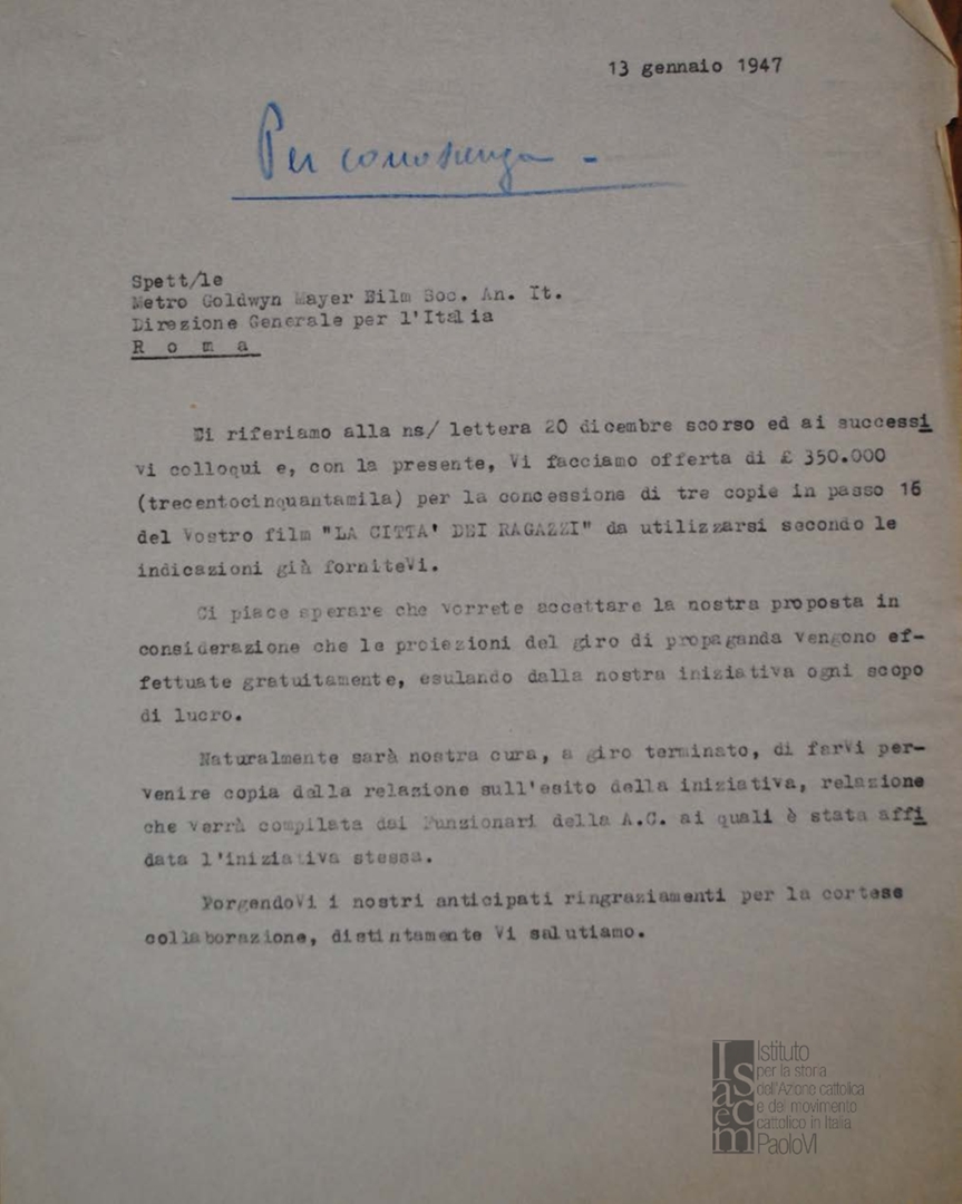 Lettera alla Direzione generale per l'Italia della Metro Goldwin Mayer Film