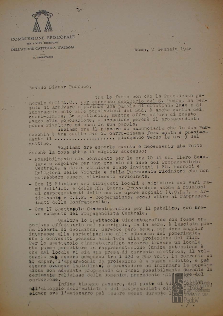 Mons. Giovanni Urbani descrive ai parroci l'azione di propaganda condotta attraverso l'utilizzo dei carri cinema e invia relative istruzioni. Dattiloscritto