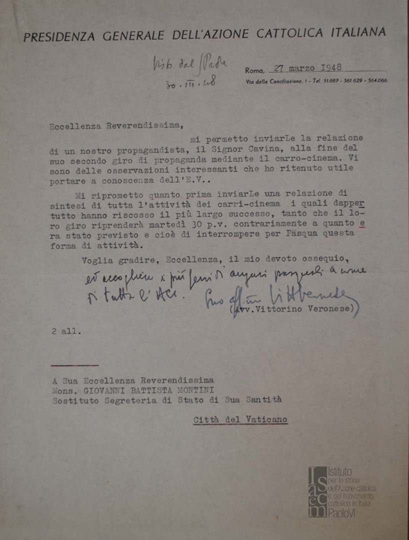 Lettera di Vittorino Veronese, presidente dell'ACI, a mons. Giovanni Battista Montini, sostituto alla segreteria di Stato di Sua SantitÃ