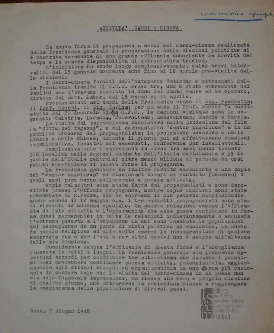 Relazione sulla nuova forma di propaganda a mezzo dei carri-cinema forniti dall'autoparco vaticano e realizzata dalla Presidenza generale dell'ACI nelle regioni dell'Italia meridionale in preparazione delle elezioni politiche. Dattiloscritto
