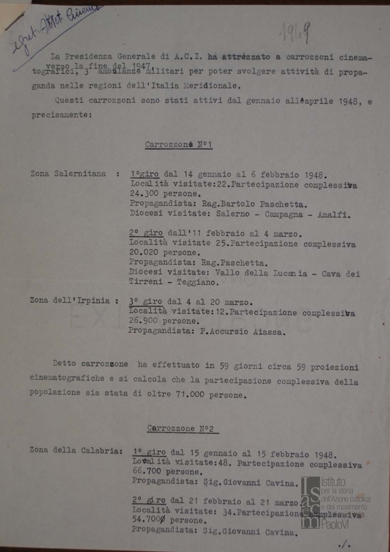 Descrizione dell'attività svolta a partire dalla fine del 1947 nelle diverse regioni italiane. Dattiloscritto
