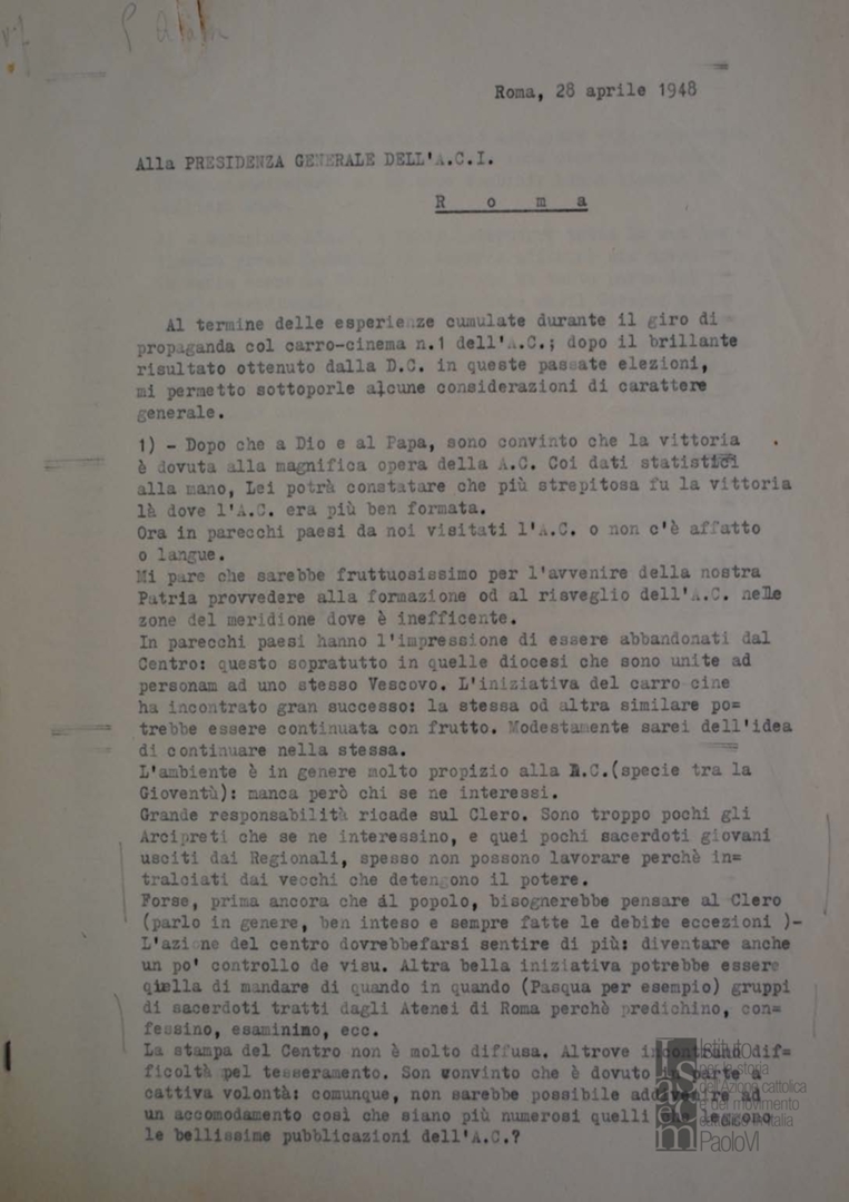 Accursio Ajassa invia alla Presidenza generale dell'ACI alcune osservazioni in merito all'attività di propaganda con i carri-cinema svoltasi a favore della Democrazia cristiana. Dattiloscritto