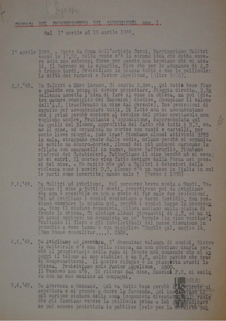"Cronaca del proseguimento del carro-cinema n. 1 dal 1° al 15 aprile 1948"