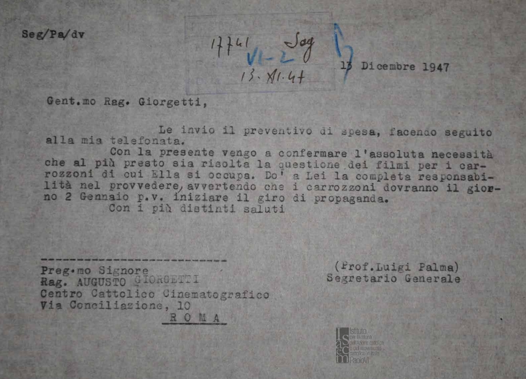 Lettera di Luigi Palma, segretario generale del Centro nazionale di Azione Cattolica di Roma, a Augusto Giorgetti, del Centro cattolico cinematografico - CCC