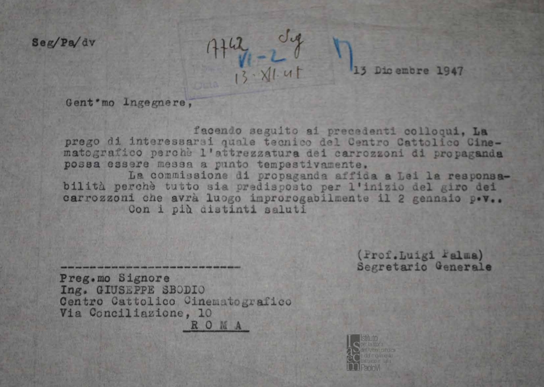 Lettera di Luigi Palma, segretario generale del Centro nazionale di Azione Cattolica di Roma, a Giuseppe Sbodio, del Centro cattolico cinematografico - CCC