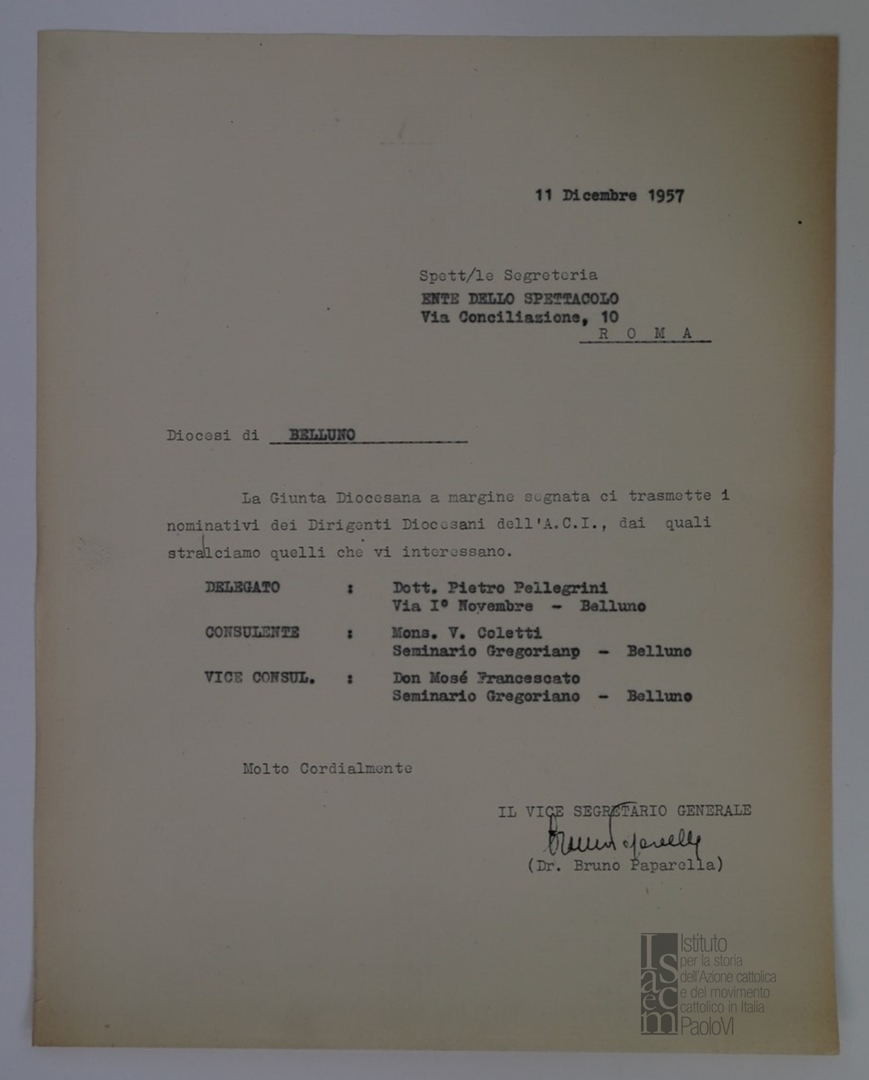 Bruno Paparella comunica i nominativi dei dirigenti diocesani dell'ACI designati per le diocesi di Belluno e Bologna. Dattiloscritto