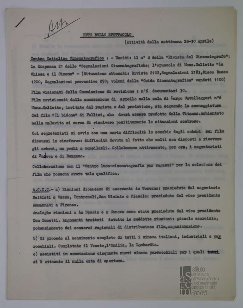 Attività editoriale e di revisione cinematografica, riunioni, censimenti, incontri, partecipazioni, ricerche. Dattiloscritto