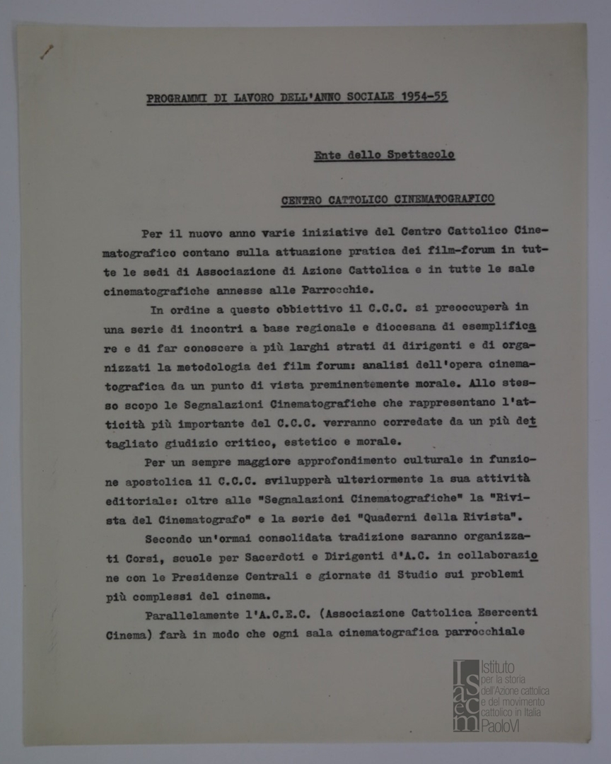 Programma delle iniziative del Centro cattolico cinematografico - CCC: incontri, attività editoriale, formazione, attività cinematografica parrocchiale, teatro, radio e televisione. Dattiloscritto
