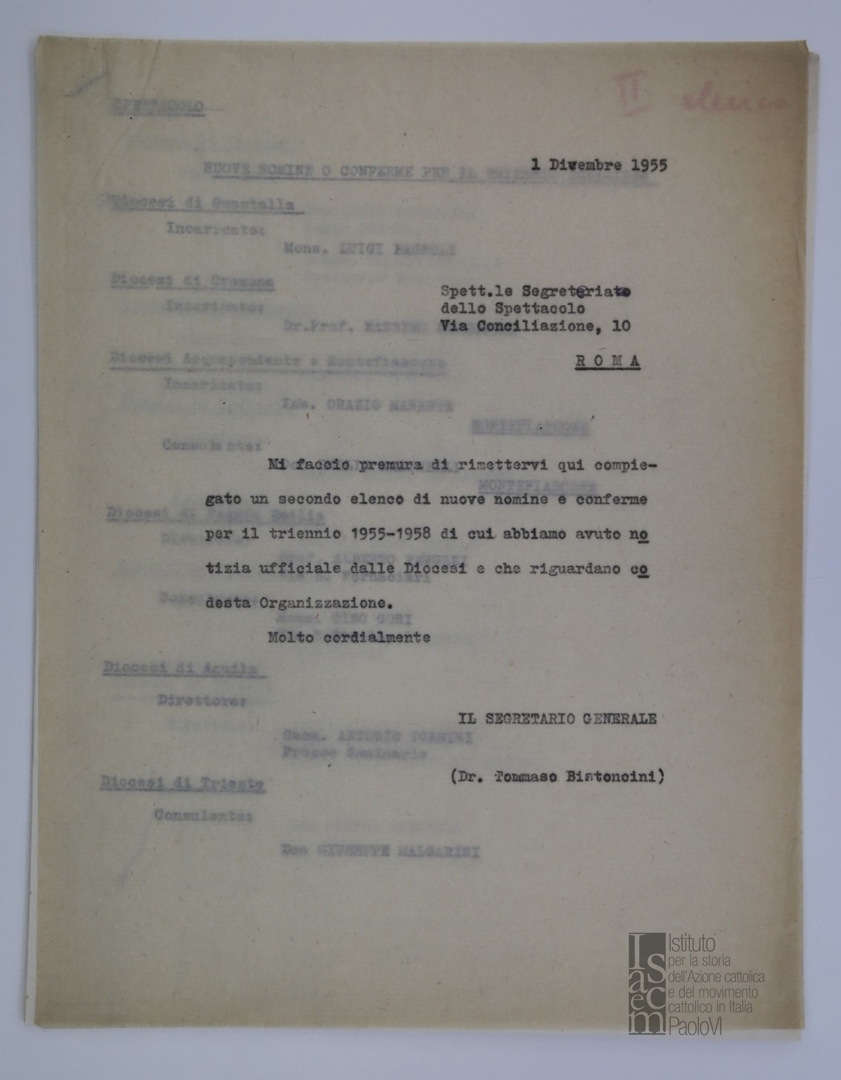 Elenco di nuove nomine e conferme per il triennio 1955-1958 in alcune diocesi italiane