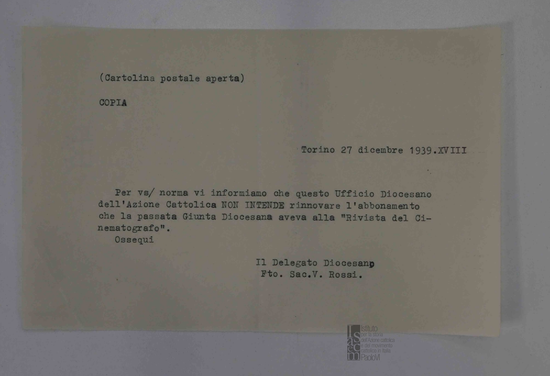 Don Vincenzo Rossi comunica la disdetta dell'abbonamento alla Rivista del Cinematografo. Dattiloscritto