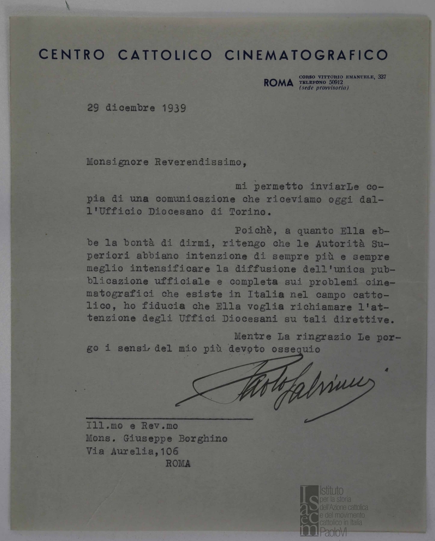 Lettera di Paolo Salviucci del Centro cattolico cinematografico - CCC, a mons. Giuseppe Borghino del vescovado di Parma