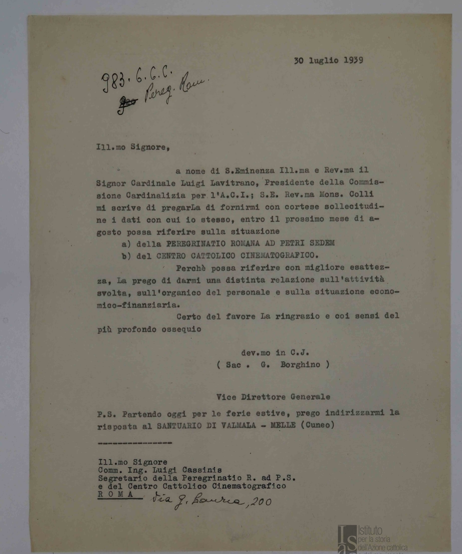 Lettera di don Giuseppe Borghino, vice direttore generale, a Luigi Cassinis, segretario della Peregrinatio romana ad Petri sedem e del Centro cattolico cinematografico - CCC