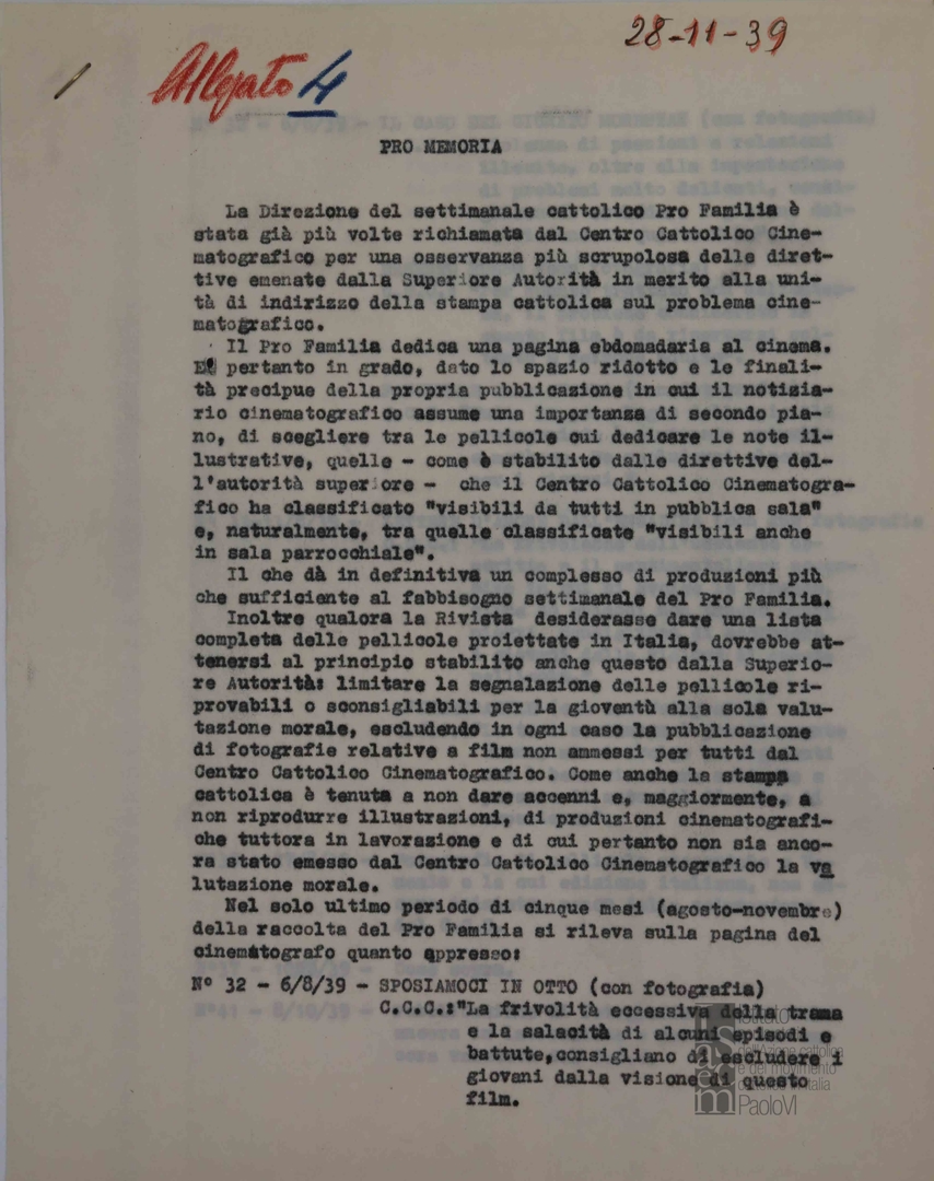 Nota riguardante alcuni contenuti del settimanale cattolico Pro Familia. Dattiloscritto