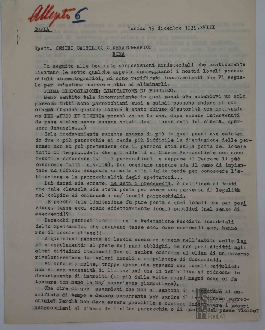 Lettera di don Angelo Salassa, delegato ecclesiastico presso l'Ufficio di Torino del Consorzio per il cinema educativo, al Centro cattolico cinematografico - CCC