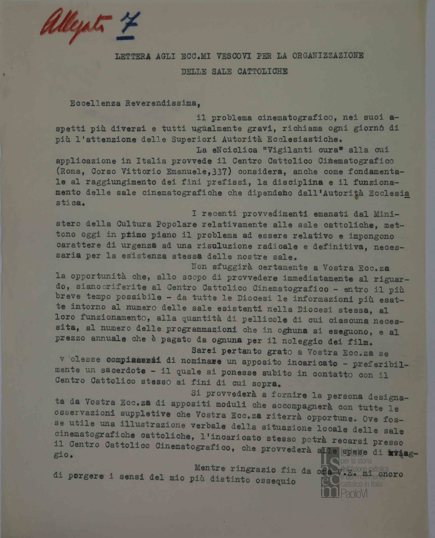 Lettera ai vescovi italiani a proposito delle disposizioni ministeriali relative alle sale cattoliche. Dattiloscritto