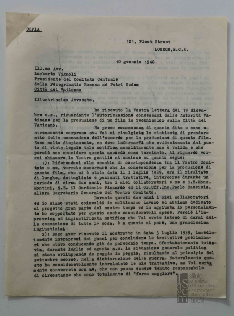 Giovanni Hanau scrive a Lamberto Vignoli in merito agli accordi per il progetto di un film sulla Città del Vaticano. Dattiloscritto