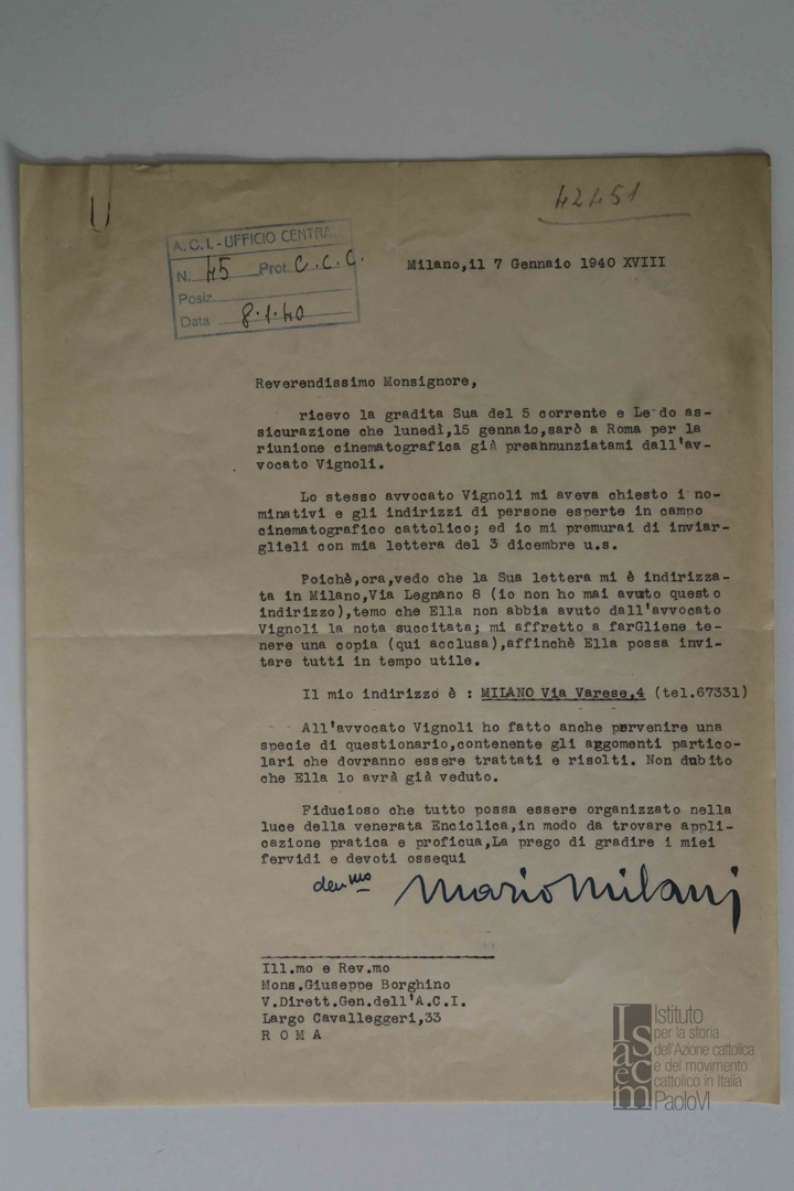Con lettera di trasmissione di Mario Milani, direttore del Consorzio per il cinema educativo, a mons. Giuseppe Borghino, vice direttore generale dell'ACI. Dattiloscritto
