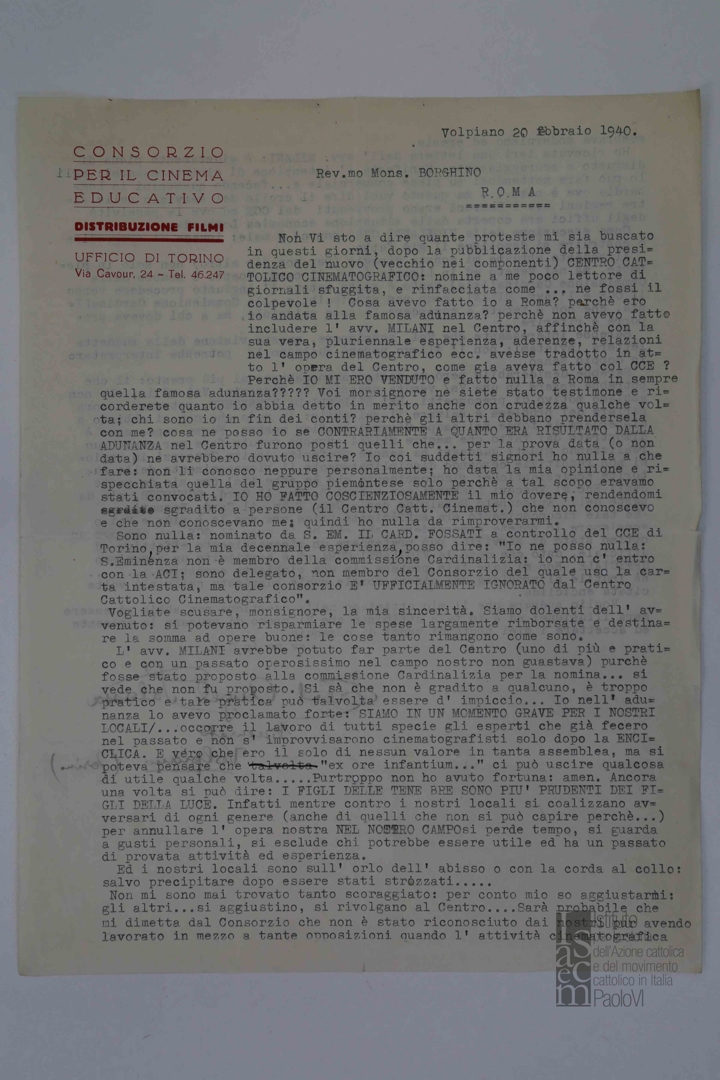 Lettera di don Angelo Salassa, delegato ecclesiastico presso l'Ufficio di Torino del Consorzio per il cinema educativo, a mons. Giuseppe Borghino, vice direttore generale dell'ACI