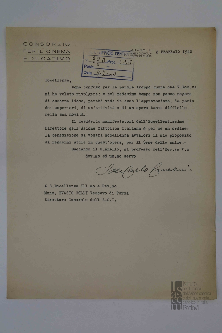Lettera di don Carlo Canziani, direttore del Consorzio per il cinema educativo - CCE, a mons. Evasio Colli, vescovo di Parma e direttore generale dell'ACI