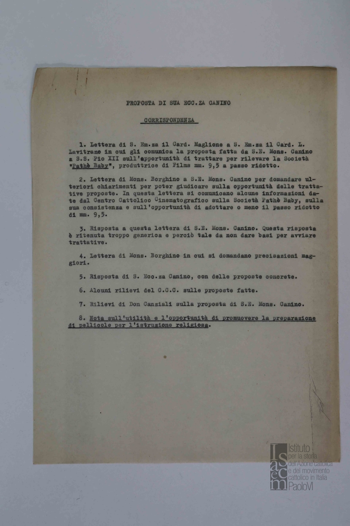Prospetto dello scambio epistolare riguardante le pellicole destinate all'istruzione religiosa. Dattiloscritto