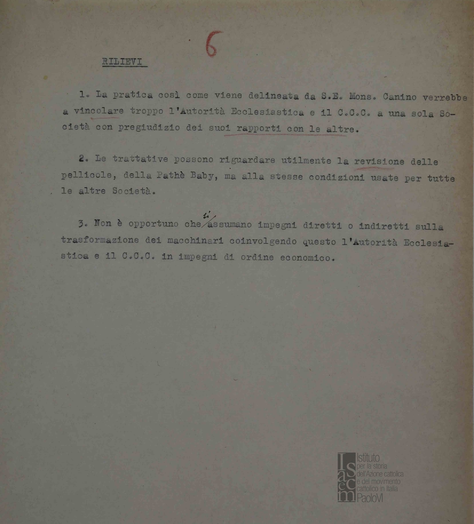 Rilievi sulla proposta di mons. Nicola Canino relativa agli accordi con la società di noleggio Pathé Baby