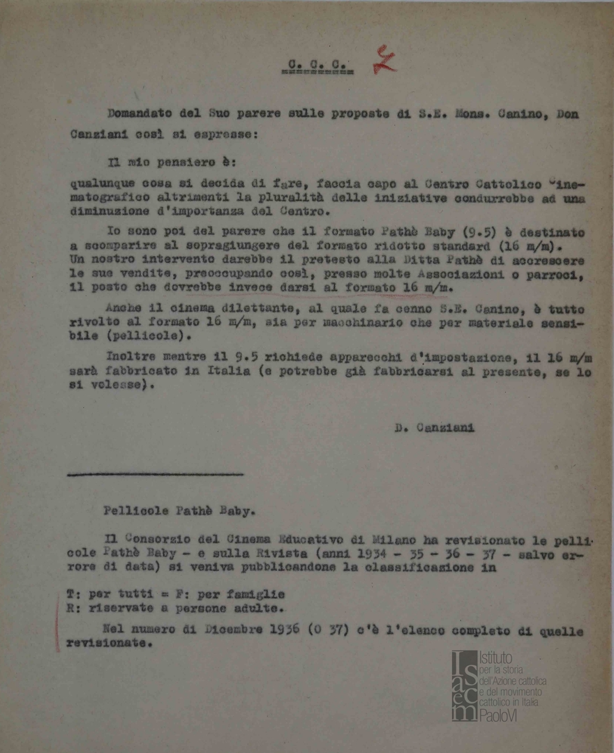 Parere di don Carlo Canziani, direttore del Consorzio per il cinema educativo - CCE, sulla proposta di mons. Canino