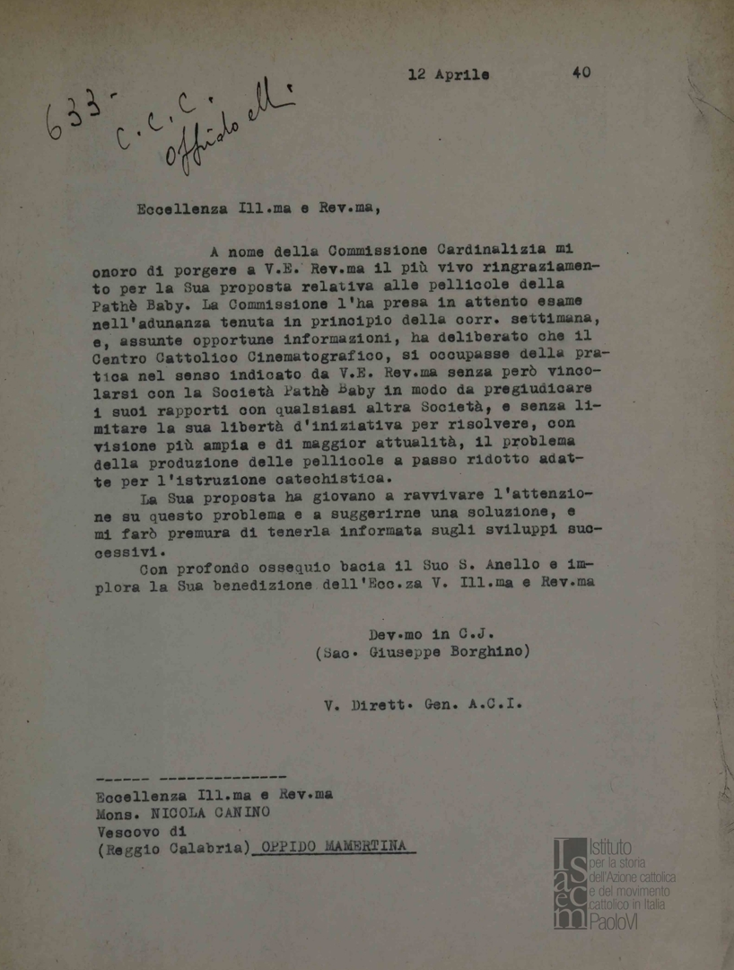 Lettera di mons. Giuseppe Borghino, vice direttore generale dell'ACI, a mons. Nicola Canino, vescovo di Oppido Mamertina in provincia di Reggio Calabria