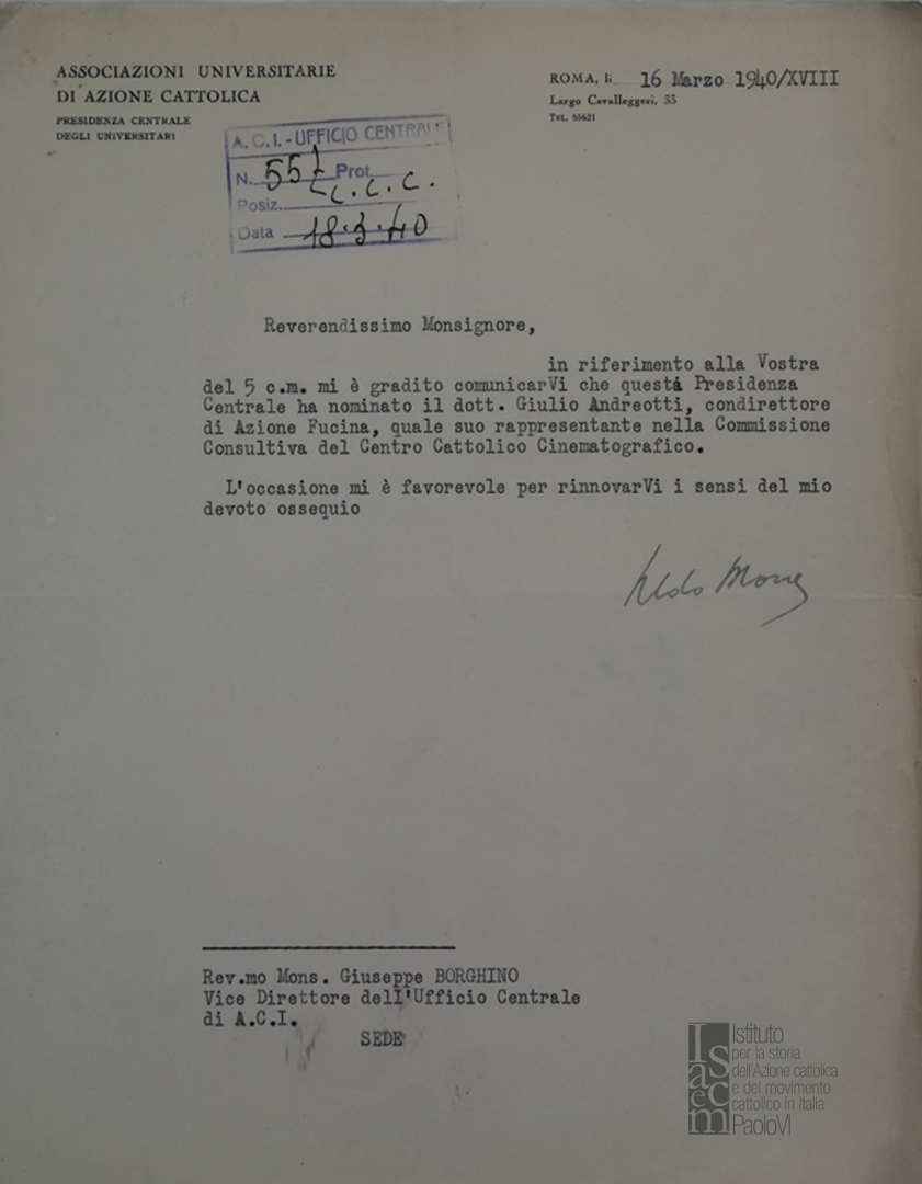 Lettera di Aldo Moro, della Presidenza centrale degli universitari (Associazioni universitarie di Azione cattolica) a mons. Giuseppe Borghino, vice direttore generale dell'ACI