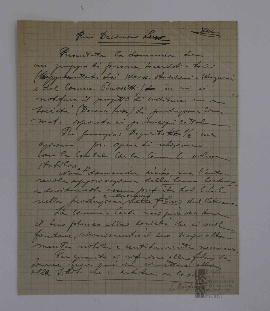 Progetto di costituzione di una nuova società di produzione cinematografica ispirata ai principi cattolici. Appunto manoscritto