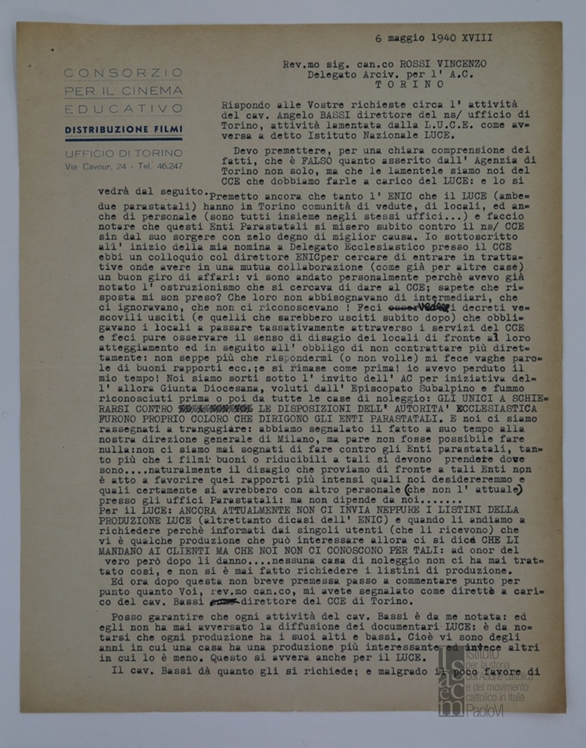 Don Angelo Salassa scrive a Vincenzo Rossi in merito all'atteggiamento di Angelo Bassi, direttore del Consorzio per il cinema educativo di Torino, nei confronti dell'Istituto Nazionale Luce e di altre case di produzione cinematografica. Dattiloscritto