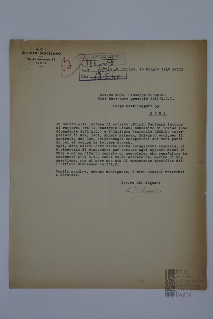 Lettera di Vincenzo Rossi, delegato arcivescovile per l'ACI di Torino, a mons. Giuseppe Borghino, vice direttore generale dell'ACI