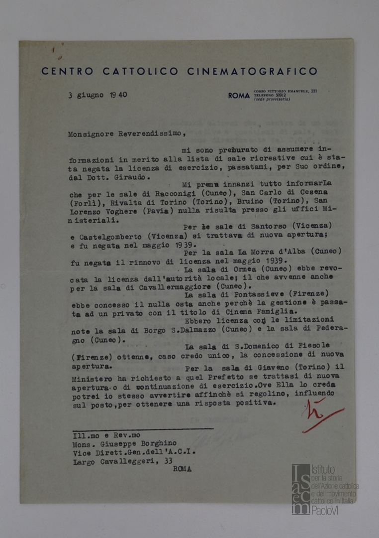 Lettera di Paolo Salviucci, segretario del Centro cattolico cinematografico - CCC, a mons. Giuseppe Borghino, vice direttore generale dell'ACI